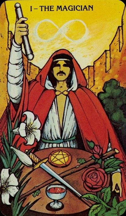Un joven de pie frente a una mesa. Sobre ella están los cuatro símbolos de los arcanos menores: copa, basto, espada y pentáculo. El Mago sostiene un bastón hacia el cielo, mientras su otra mano apunta al suelo. Es el canal entre el mundo espiritual y el material. Sobre su cabeza, el símbolo del infinito. En la cintura, una serpiente que se muerde la cola, el ouroboros. Su manto blanco y capa roja reflejan pureza e intención, acción y poder.