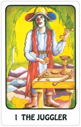 La figura aparece también frente a una mesa, aunque con herramientas menos definidas. A veces se incluyen dados, monedas, cuchillos o copas. Su postura es menos ceremoniosa y más lúdica: el Mago del Marsella es más un artesano, ilusionista o aprendiz que un canal espiritual. Representa la habilidad manual, la acción astuta, el dominio de lo cotidiano.