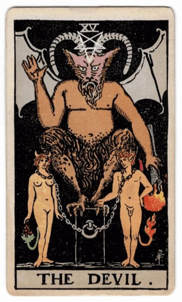 Este es el punto crucial de la carta. Hay un hombre y una mujer (los mismos de Los Enamorados, pero “caídos”). Tienen cuernos y colas, sugiriendo que su naturaleza se ha animalizado por la falta de conciencia.